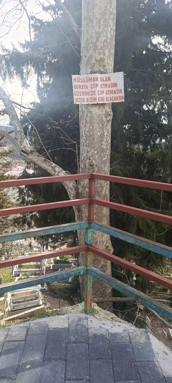 Mezarlıkta bulunan büyük çınar ağacına asılan bir tabela ise dikkat çekiyor. Tabelada “Müslüman olan buraya çöp atmasın. Üzerimize çöp atmasın, siz de bizim gibi olacaksınız” ifadeleri yer alıyor. Bu yazı, mezarlığın durumuna dikkat çekmek isteyen vatandaşların sessiz ama anlamlı bir uyarısı olarak görülüyor.