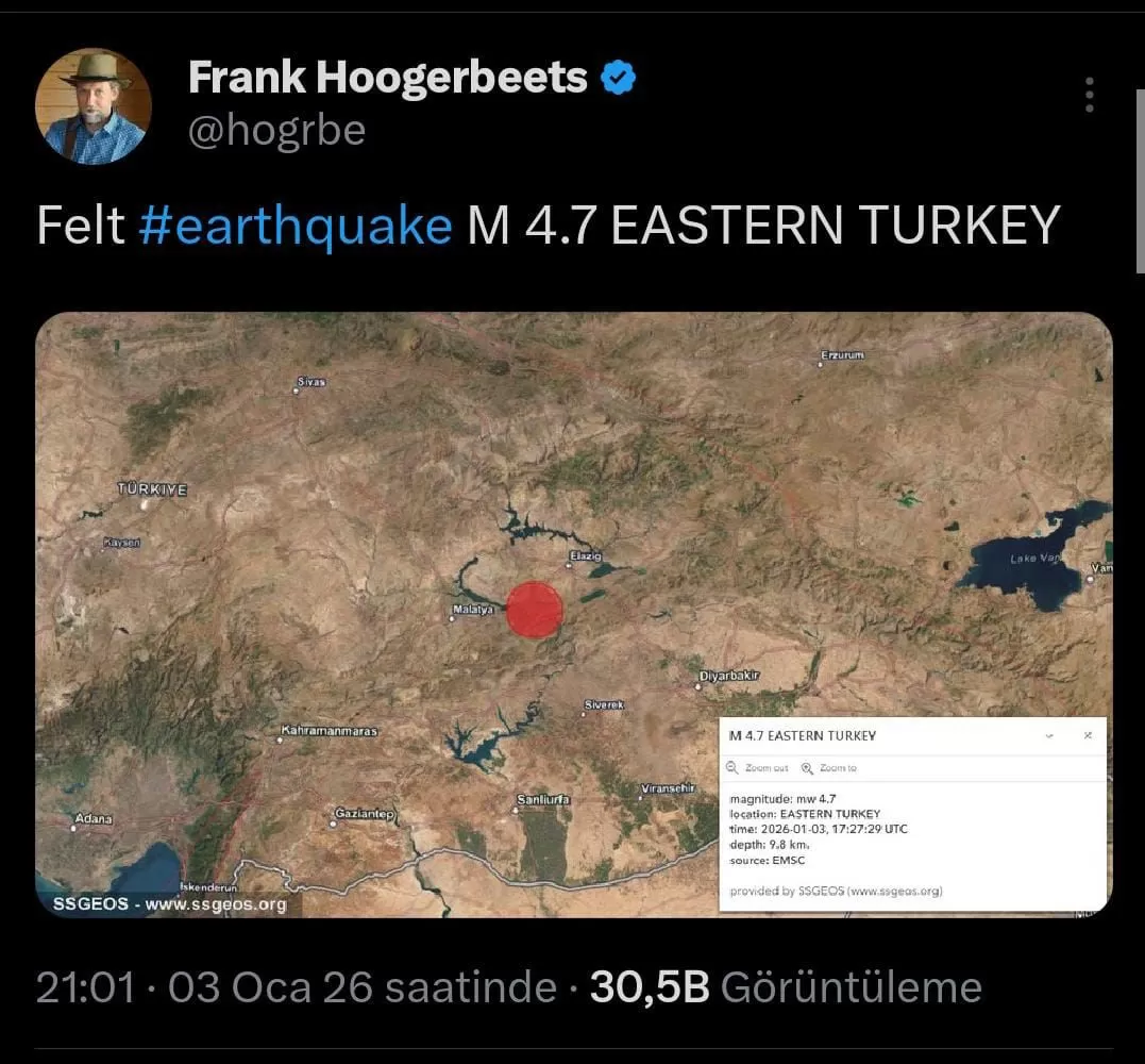 Elazığ’da meydana gelen 4.7 büyüklüğündeki deprem sonrası, daha önce yaptığı deprem tahminleriyle kamuoyunda geniş yankı uyandıran Frank Hoogerbeets’ten dikkat çeken bir değerlendirme geldi. Hoogerbeets, depremin Doğu Türkiye’de sismik açıdan kritik bir noktada gerçekleştiğini belirtti.