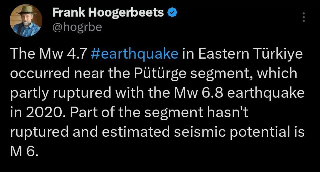 Elazığ’da meydana gelen 4.7 büyüklüğündeki depremin ardından Frank Hoogerbeets’ten dikkat çeken bir uyarı geldi. Hoogerbeets, depremin Pütürge segmenti yakınında gerçekleştiğini ve fayın henüz tamamen kırılmadığını söyledi.