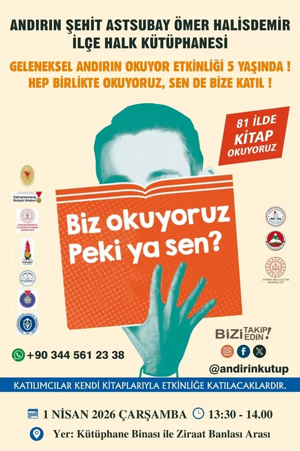 “Hep birlikte okuyoruz, sen de bize katıl!” sloganıyla duyurulan etkinlik, toplumda okuma alışkanlığını pekiştirmeyi ve kitapların büyülü dünyasına dikkat çekmeyi hedefliyor. Kütüphane yetkilileri, her yaştan katılımın beklendiği bu anlamlı buluşma ile Andırın’da okuma kültürünü bir şölene dönüştürmeyi amaçlıyor.