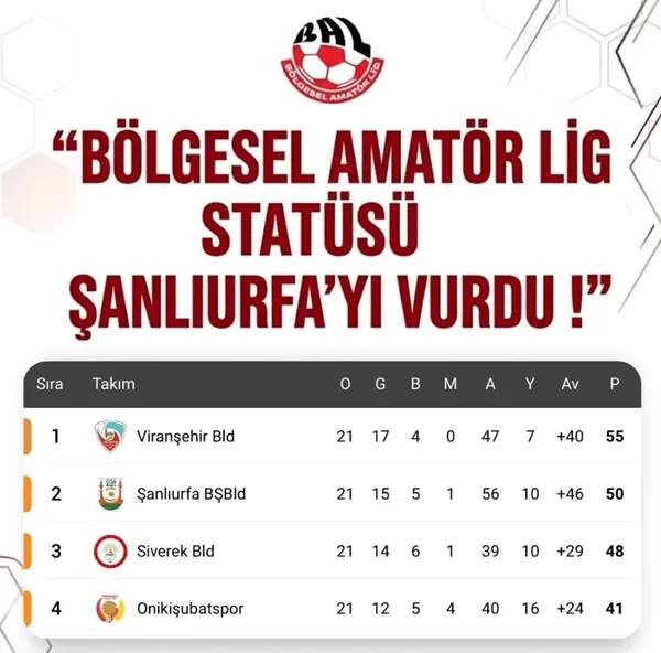 Bölgesel Amatör Lig’de (BAL) uygulanan mevcut statü, Kahramanmaraş ve Şanlıurfa takımlarını zor durumda bırakırken, futbol kamuoyunda şaşkınlık yaratan düşme ve yükselme kuralları ekiplerin kaderini belirliyor.