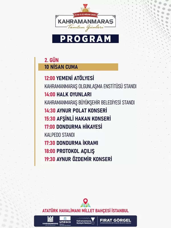 İstanbul Atatürk Havalimanı Millet Bahçesi’nde devam eden “Kahramanmaraş Tanıtım Günleri”, ikinci gününde de ziyaretçilerini unutulmaz bir programla karşılamaya hazırlanıyor. Büyükşehir Belediyesi öncülüğünde düzenlenen etkinliklerde bugün, geleneksel zanaatlardan sahne performanslarına kadar geniş bir yelpazede Maraş ruhu sergilenecek.