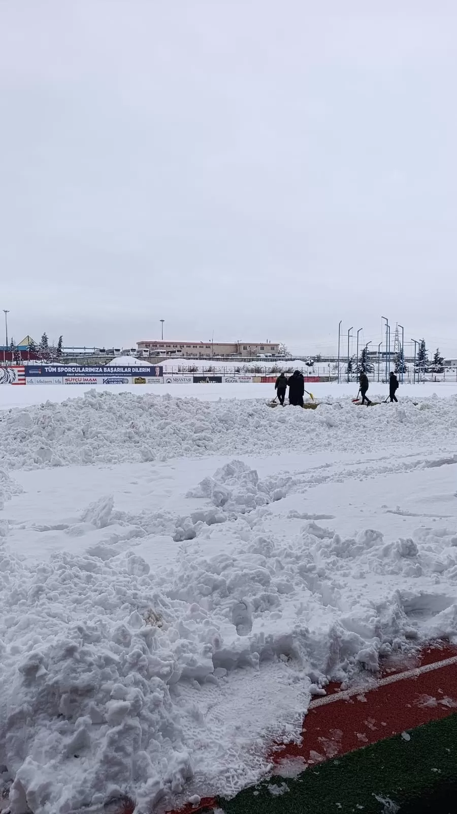 Saha zeminindeki yoğun kar tabakasını temizlemek için iş makineleri ve çok sayıda personel ile başlatılan hummalı çalışma devam ediyor. Ekipler, çim zemine zarar vermeden karı tahliye etmek için titiz bir operasyon yürütüyor.