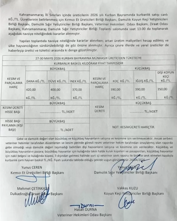 Kahramanmaraş’ta Kurban Bayramı hazırlıkları sürerken, canlı hayvan kilogram fiyatları Kırmızı Et Üreticileri Birliği, Damızlık Birlikleri, Veteriner Hekimleri Odası ve Ziraat Odası başkanlarının katılımıyla düzenlenen toplantıda belirlendi. Toplantı sonucunda büyükbaş ve küçükbaş hayvanlar için cinsten cinse değişen yeni fiyat tarifesi kamuoyuyla paylaşıldı.