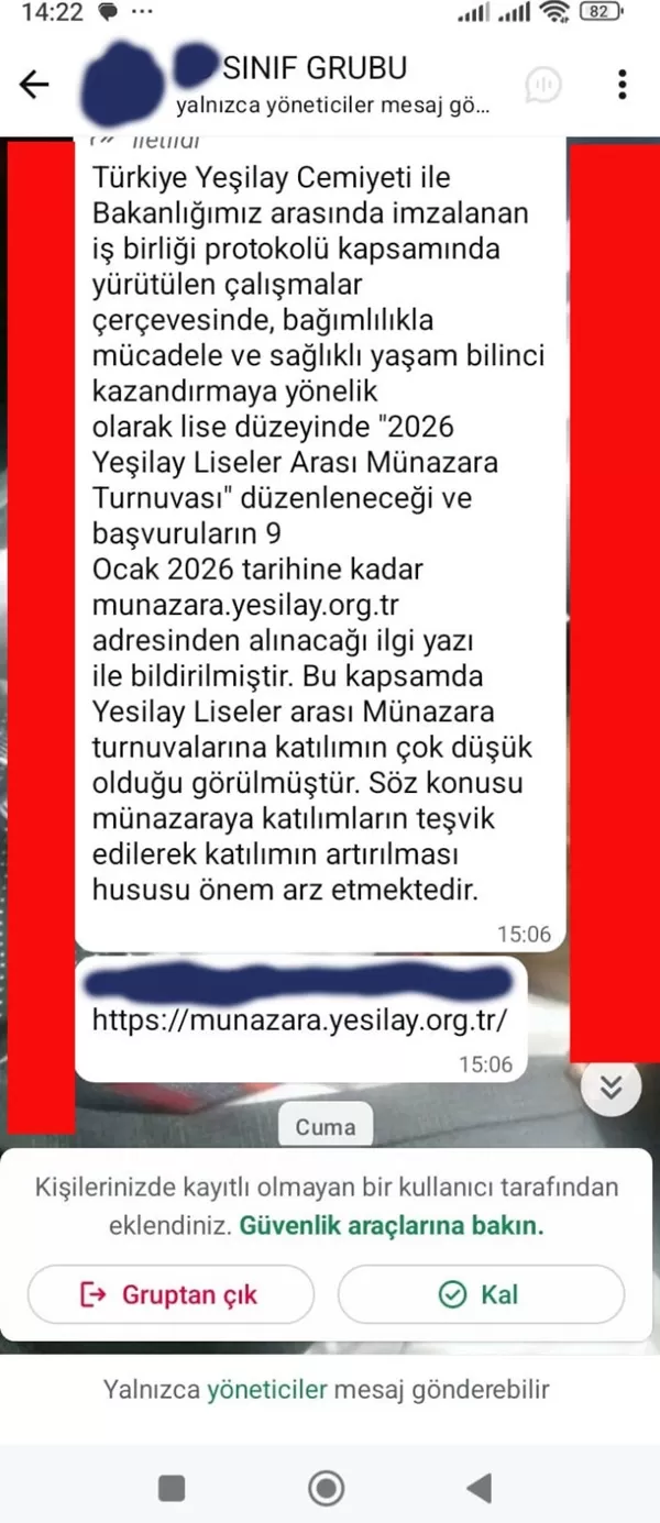 olarak lise düzeyinde “2026 Yeşilay Liseler Arası Münazara Turnuvası” düzenleneceği ve başvuruların 9 Ocak 2026 tarihine kadar munazara.yesilay.org.tr adresinden alınacağı ilgi yazı ile bildirilmişti. Bu kapsamda Yesilay Liseler arası Münazara turnuvalarına katılımın çok düşük olduğu görülmüştür. Söz konusu münazaraya katılımların teşvik edilerek katılımın artırılması hususu önem arz etmektedir” ifadesine yer verildi.