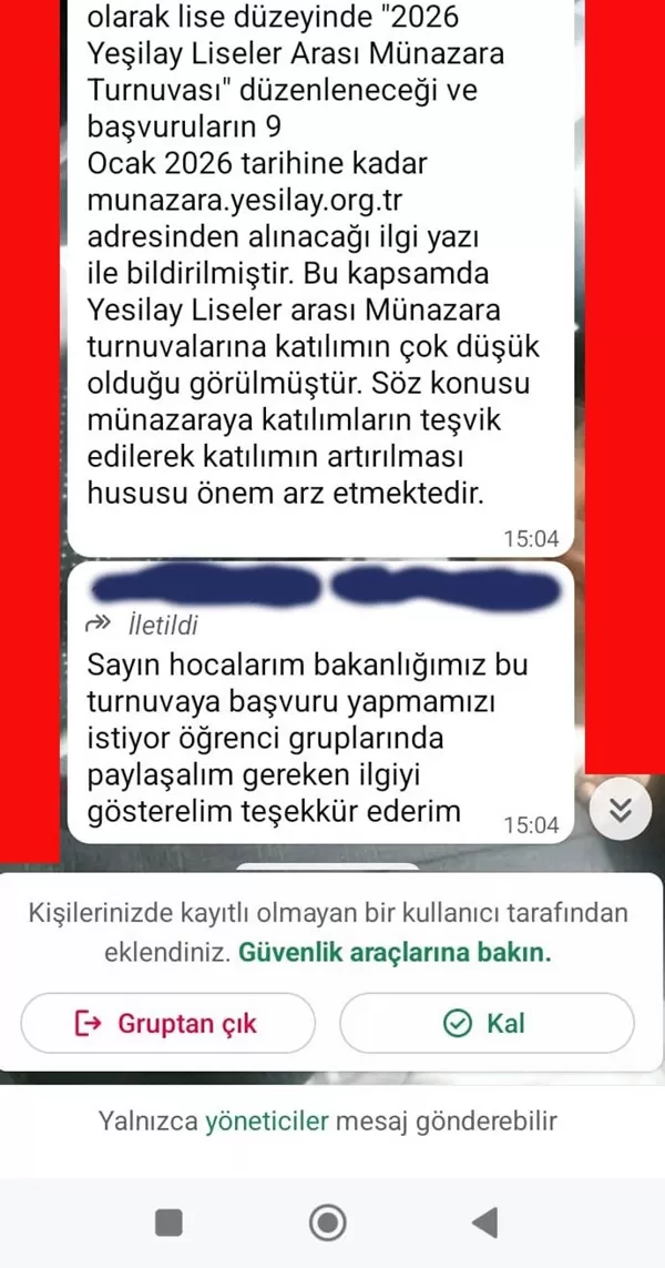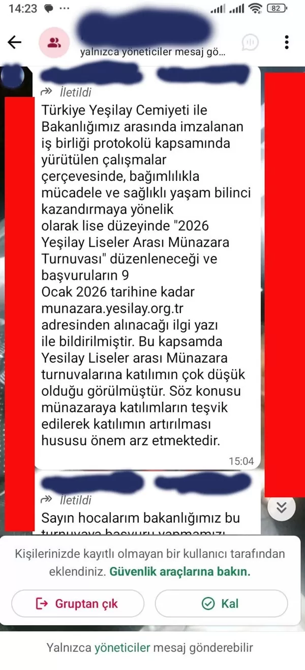 Yeşilay’ın, gençlerin sağlıklı yaşam alışkanlıklarını benimsemesi, yeteneklerini ortaya çıkarması ve bağımlılıklar konusunda farkındalık kazanması amacıyla düzenlediği “Yeşilay Liseler Arası Münazara Turnuvası” na Kahramanmaraş’ta oldukça katılım az. Bu durumdan müzdarip olan Liselerdeki yöneticiler öğretmenler okul watsapp gruplarında öğrencilere ve öğrenci velilerine katılım için uyarılarda bulunuluyor. Bu baskı ise telefonlara gelen mesajda da anlaşıldığı gibi öğrenci ve velilerde bu işten muzdarip olarak sitem etmeye başladı.